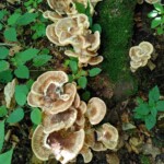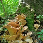 Der gesamte Fruchtkörper kann sehr groß werden über 50*50 cm. Hier haben wir viele Fruchtkörper aus einem Mycel heraus, das in einem mächtigen alten Buchenstrunk wächst.