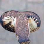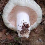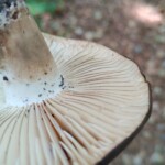 Betrachtet man dann die Unterseite des Hutes überraschen weit entfernt stehende, cremeweiße Lamellen mit vielen Zwischenlamellen. Bei Verletzung oder Anschnitt röten Lamellen, Fleisch und Stiel in wenigen Minuten. Später werden sie schwarz. Ein Schwärz-Täubling eben.