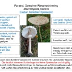 Der Parasol ist mit diesen Eigenschaften zu bestimmen. Es gibt zwar noch mehr Riesenschirmlinge, aber nur im Garten und auf Komposthaufen wächst ein magen-darm-giftiger Gift-Garten-Riesenschirmling. Er rötet und hat keinen genatterten Stiel.