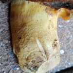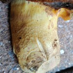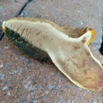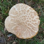 Der Trockenheit getrotzt, aber mit deutlichen Trockenschäden ein Wurzelnder Bitterröhrling. Er ist so trocken, dass nur noch die Röhren bläuen und der Schnitt schon ganz braun ist. Typisch dagegen die gelbbraune Netzzeichnung am Stiel.